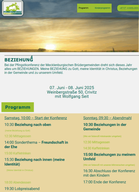 Ab sofort ist die Anmeldung zum Horizonte Zeltlager möglich. Herzlich willkommen im „Land der Pyramiden“. Wer: Kinder von 6-10 Jahren Start: Dienstag, 12. August, 16 Uhr Ende: Sonntag, 17. August, 13 Uhr Ort: Steinbecker Weg 4, 18292 Bellin Kosten: 80€ Anmeldung: bis 22. Juli 2025 mit dem Anmeldeformular Kontakt: horizonte.zeltlager@gmail.com oder bei Irina: 0173/8161001 (Die […]