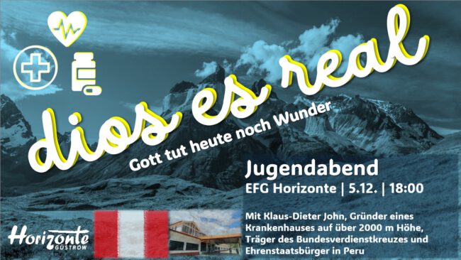 Herzliche Einladung zum Jugendabend „Dios es real – Gott tut heute noch Wunder“ am 5. Dezember, 18 Uhr mit Klaus-Dieter John, Gründer eines Krankenhauses auf über 2000m Höhe, Träger des Bundesverdienstkreuzes und Ehrenstaatsbürger in Peru.