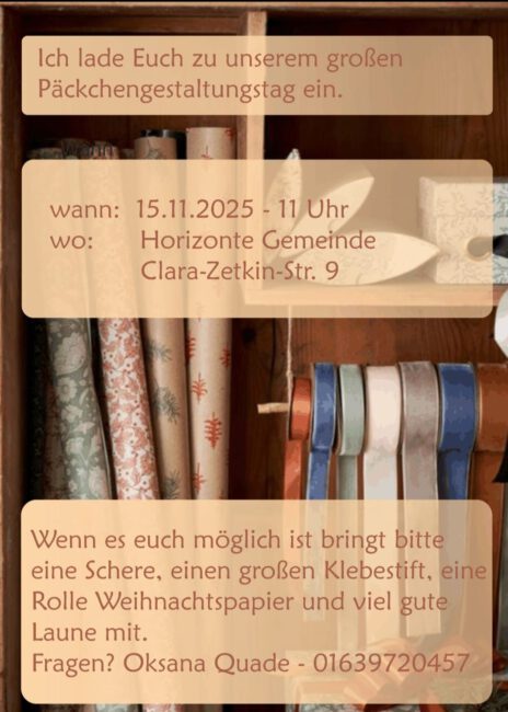 Herzliche Einladung zum Päckchen gestalten am Samstag, 15. November, 11 Uhr im Horizonte Zentrum.