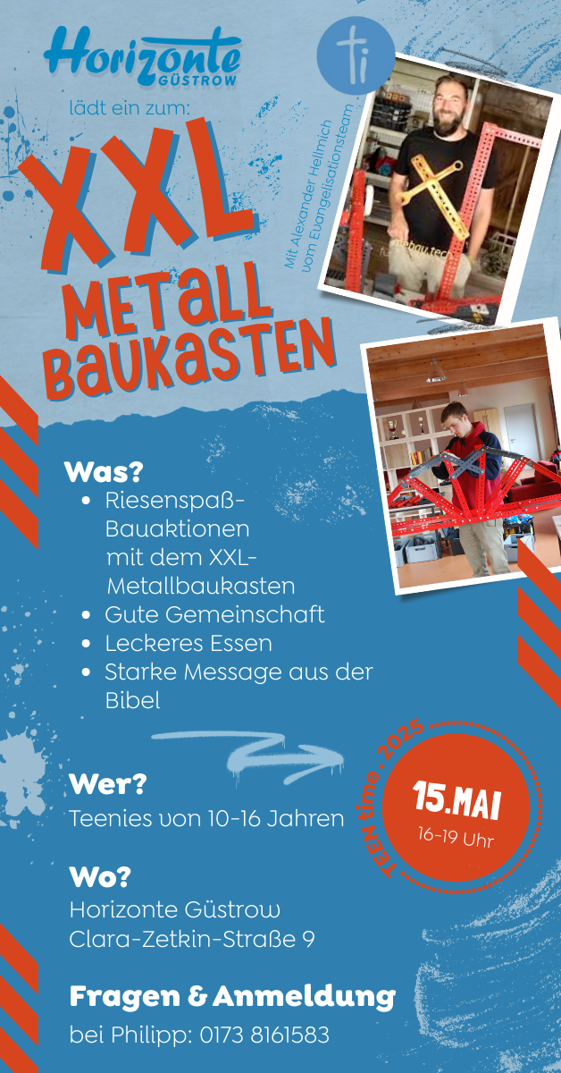 XXL-Baukasten Herzliche Einladung zum XXL-Metallbaukasten am 15. Mai, 16-19 Uhr für alle Teenies von 13-16 Jahren Anmeldung bei Philipp: 0173 / 8161583Event details:Start date15. Mai 2025 16:00End date15. Mai 2025 19:00KalenderEventJugendTeeniesGoogle Calendar iCal feed URL https://www.horizonte-guestrow.de/?rhc_action=get_icalendar_events&ID=3471 Füge den iCal Feed zu deinem eigenen Kalender hinzu (z.B. Google Kalender, Outlook, Thunderbird, iCal). Download ICS file Organizer details:OrganizerVenue DetailsVenueHorizonte ZentrumAdresseClara-Zetkin-Straße 9CityGüstrowPostal code18273CountryGermanyInformationGet directionsGet directions |||:: Clara-Zetkin-Straße 9, 18273 Güstrow, Deutschland